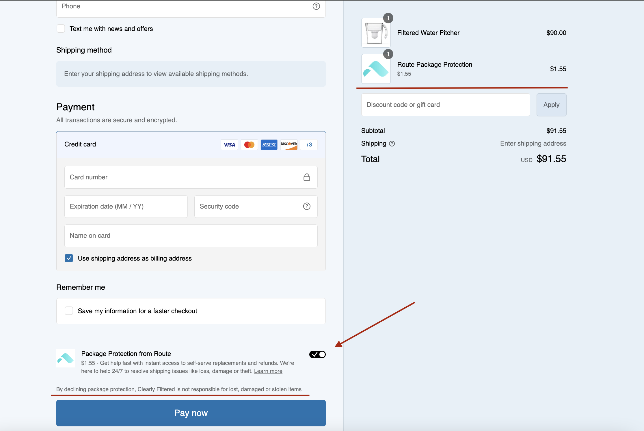 To remove Route Package Protection, simply uncheck the box on the checkout page: